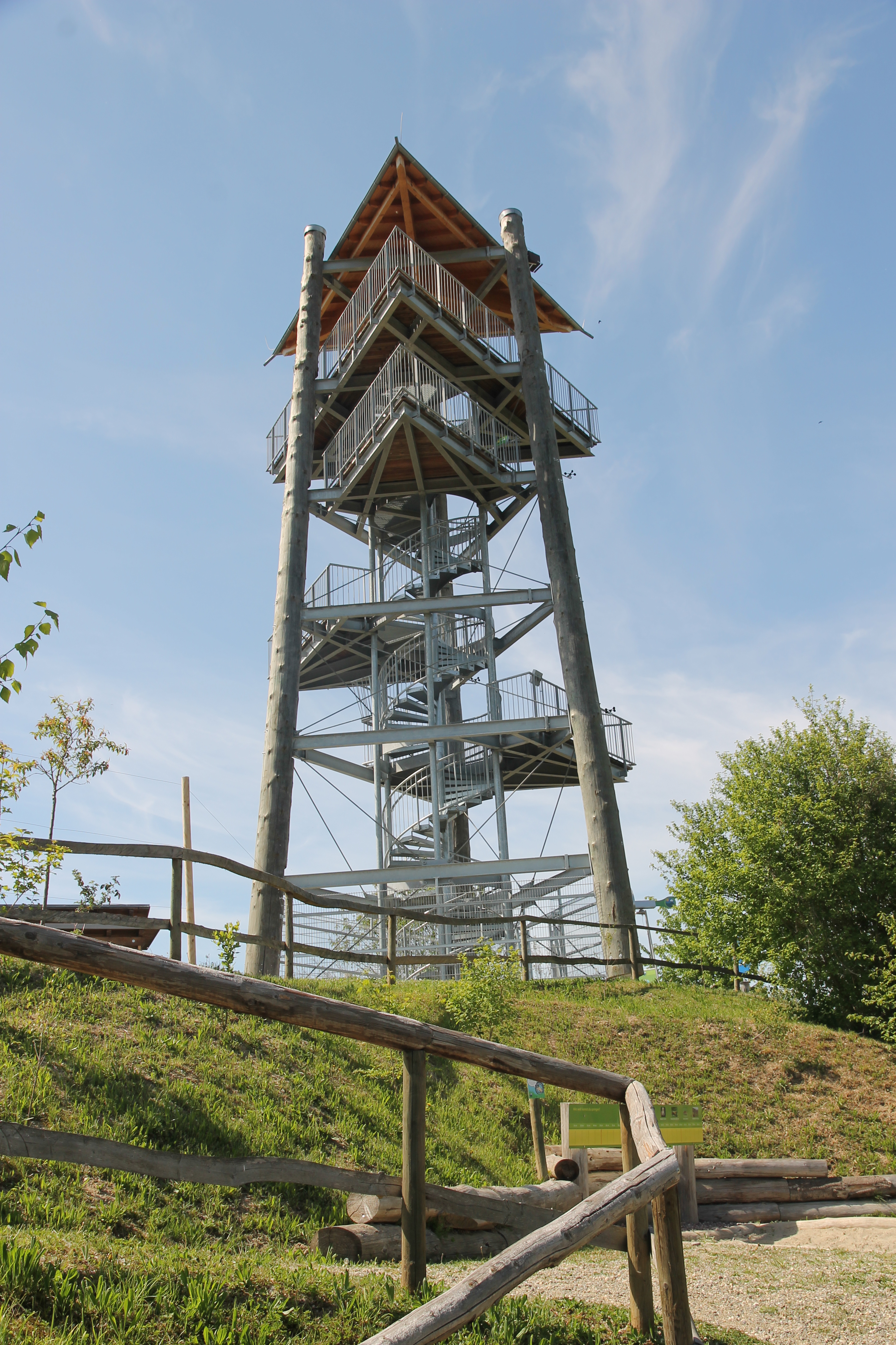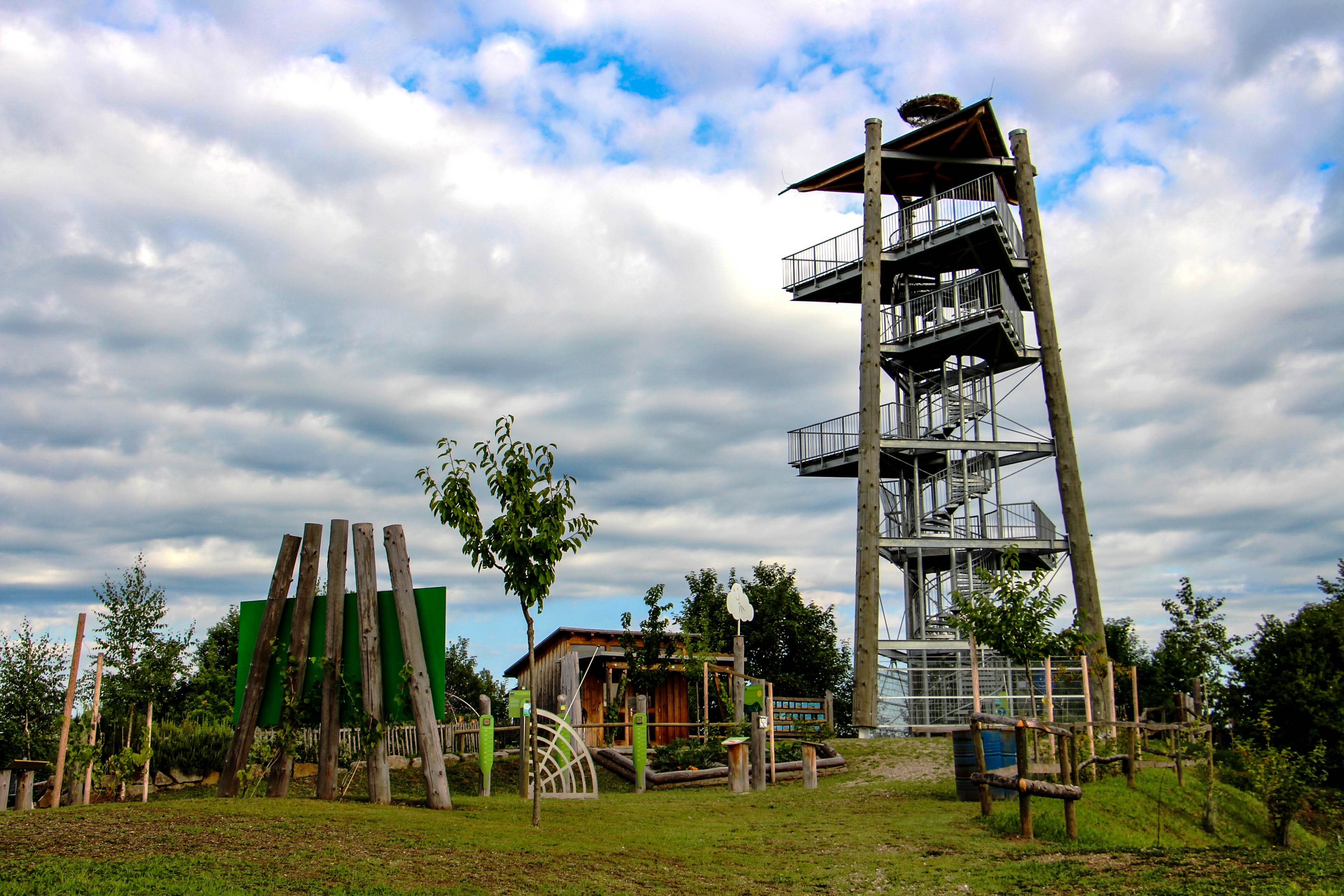 Ein weiteres Highlight des Klimawandelgartens ist der 18 m hohe Aussichtsturm (Günter-Gorecky-Turm). 86 Treppenstufen führen in luftige Höhen. Der Aufstieg wird mit einer großartigen Aussicht in die Rheinebene und das nahe Elsass belohnt. Auch einen Blick auf den "Silverstar" - die Achterbahn des Europa-Park kann man dabei werfen.