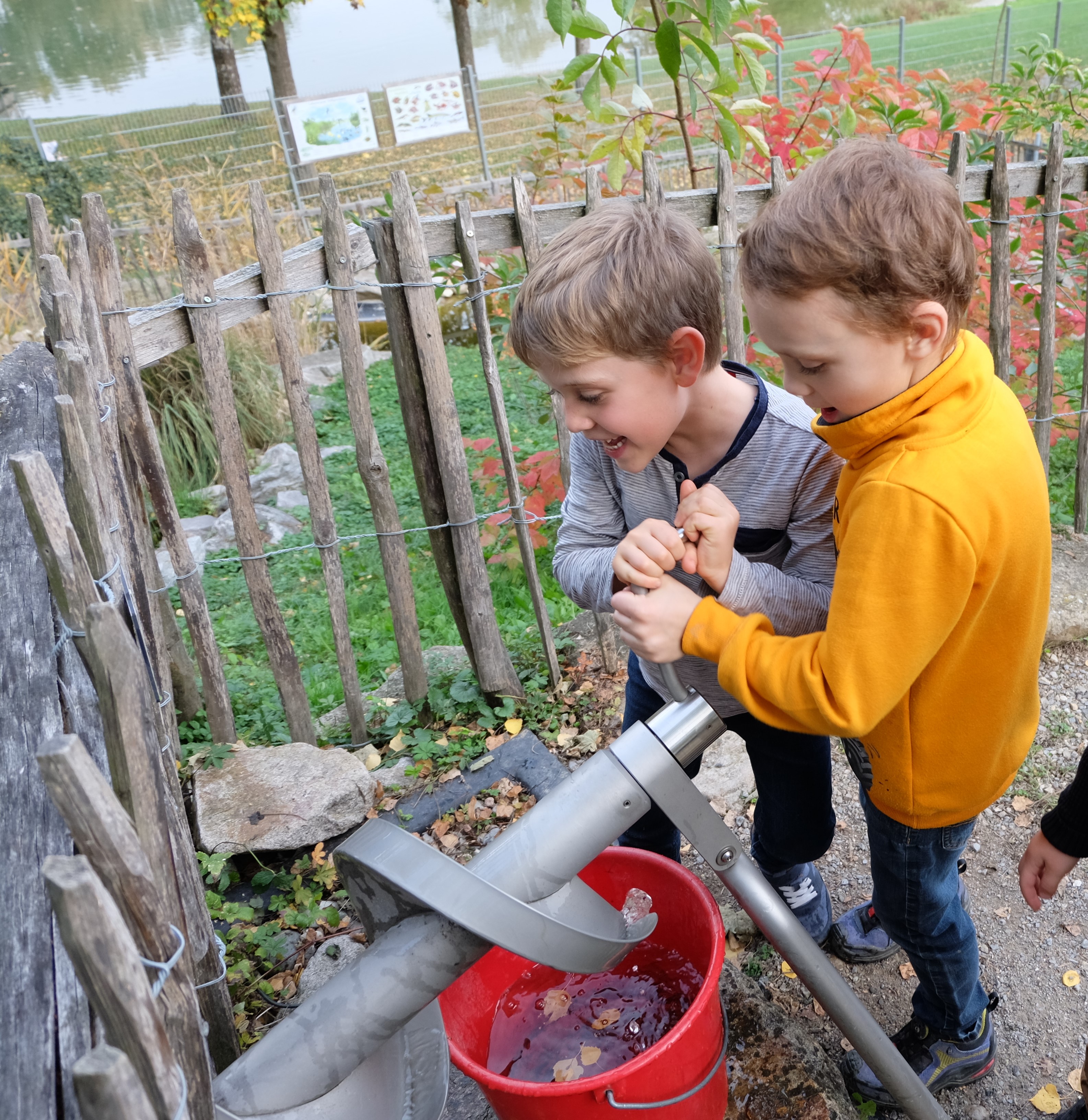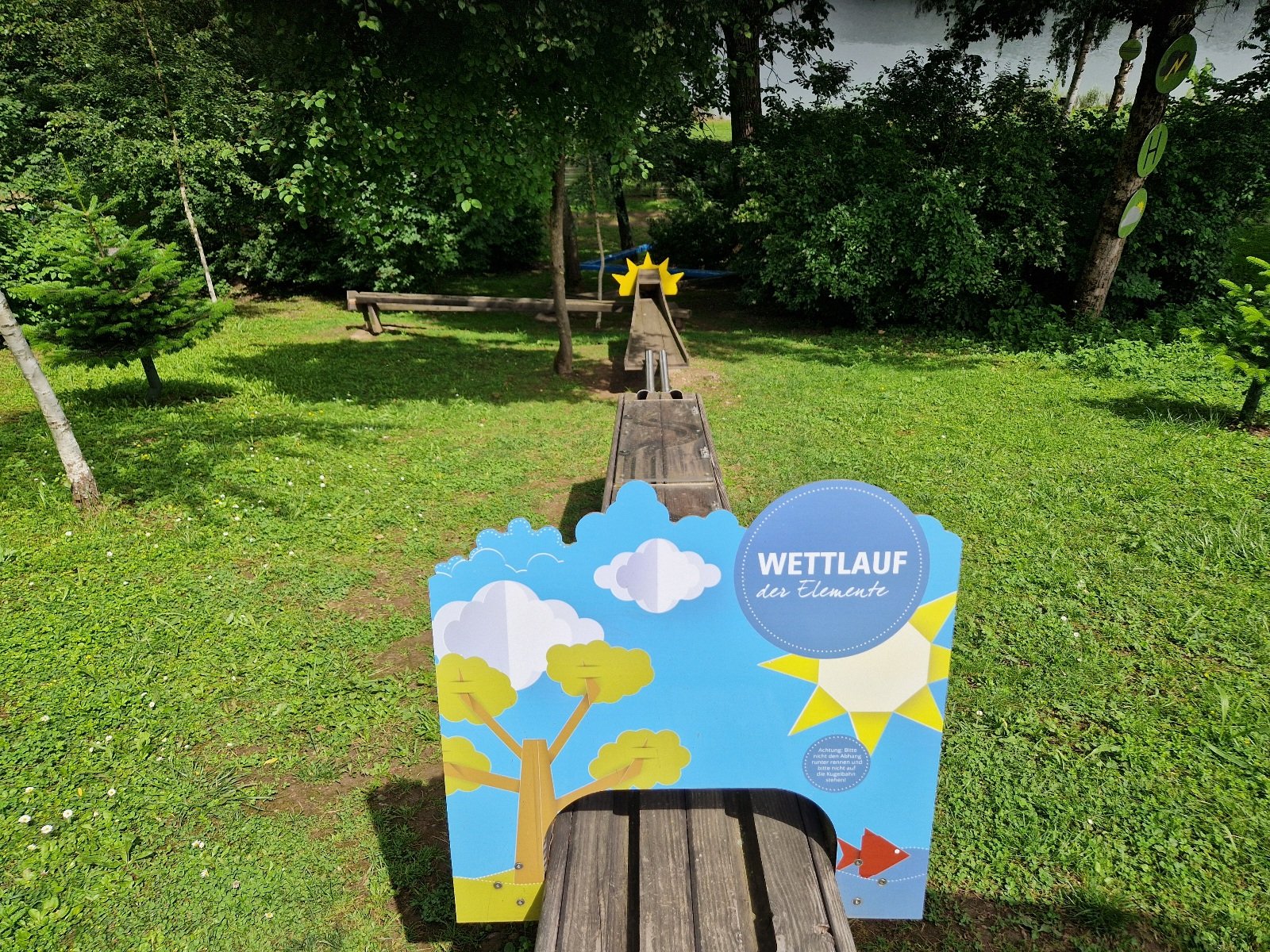 Ganz neu ist eine Kugelbahn auf dem Gelände eingerichtet, die sich über 30 Meter vom Hügel abwärts durch den Garten schlängelt. Für die Benutzung können Holzkugeln an einem Automaten für 1,- € gekauft werden. Besonders großen Spaß macht es den Kindern, wenn sie ihre Kugeln um die Wette über die Hindernisse sausen lassen können. Welche Murmel kommt wohl als erste unten an?